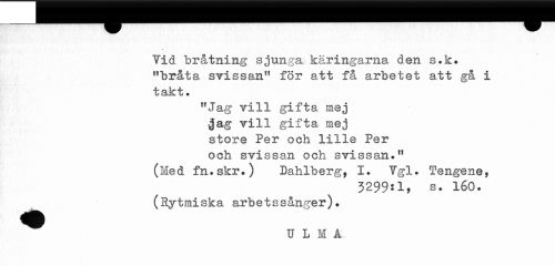 //// Tid bråtning sjunga käringarna den s.k. "bråta svissan" för att få arbetet att gå i i* slet < //// "Jag vill gifta mej vill gifta mej store Per och lille Per och svissan och svissan." (Med fn.skr.) Dahlberg, I. Ygl. Tengene, //// 3299:1, s. 160. //// (Hytmiska arbetssånger)• ^ U L M A ////