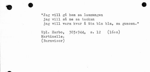 //// "Jag vill gå hem sa lammungen jag vill så me sa tackan //// jag vill vara kvar å äta bla b la, sa gumsen." //// Upl. Harbo, 303:944, s. 12 (l6:o) //// Martinelie. //// (Barnvisor) //// T ////