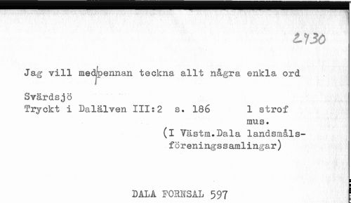 //// ¦ 1 //// tUö //// Jag vill medpennan teckna allt några enkla ord //// I***! • • « //// bvardsjo //// Tryckt i Dalälven 111:2 s. 186 1 strof //// mus. //// (i Yästm.Dala landsmålsförenings s amlingår) //// i //// BALA FORMSAL 597 j ////