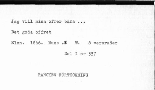 //// Jag vill mina offer bära • ?» Det goda offret //// Elen. 1866. Muns .£ W. 8 versrader //// Del I nr 337 //// RANCKEN FÖRTECKNING ////