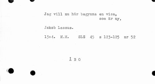 //// Jag Till nu här begynna en visa, //// som är ny, //// Jakob Lassus. //// 13:4. M.M. SL3 45 s 123-125 nr 52 //// ÅBO ////