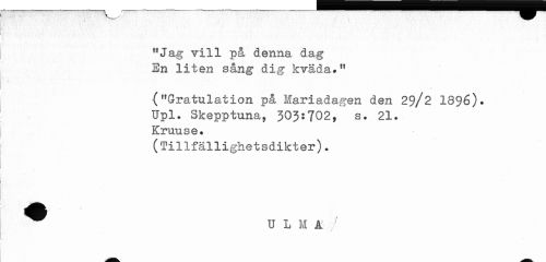 //// -„- ^ w //// MJag vill på denna dag En liten sång dig kväda.M //// ("Gratulation på Mariadagen den 29/2 1896)» //// Upl. Skepptuna, 303:702, s. 21. //// Kruuse. //// (Tillfällighetsdikter). ^ ULM k /¦ ////