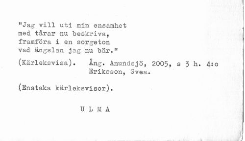 //// "Jag Till uti min ensamhet med tårar nu beskriTa. framföra i en sorgeton vad ängslan jag nu bär." //// (Kärlefcsvisa). Ing. Anundsjö, 2005, s 3 h. 4:o //// Eriksson, Svea. //// (Enstaka kärleksvisor). //// U L M A //// \ //// ' :* : M/J ////