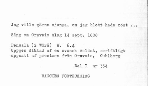 //// Jag ville gärna sjunga, om jag blott hade röst ... Sång om Oravais slag 14 sept. 1808 Pensala (i Wörå) W. 6.4 //// Uppges diktad af en svensk soldat, skriftligt uppsatt af prestson från Orevais, Guhlberg //// Del I nr 334 //// RAICKEN PÖRTBCKHIHG ////