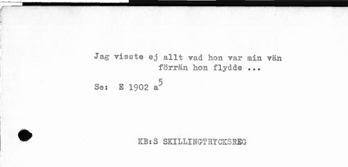//// • . ... //// Jag visste ej allt vad hon var min vän //// förrän hon flydde ... //// Se: E 1902 a5 ////
