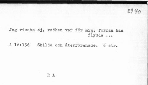//// Ja g visste ej, vadhan var för mig, förrän han //// flydde ... //// Å 16:156 Skilda och återförenade. 6 str. //// R A //// \ ////