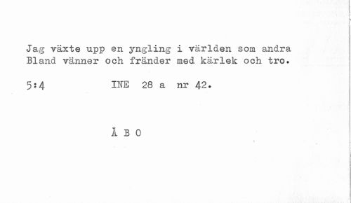 //// I //// Jag växte upp en yngling i världen som andra Bland vänner och fränder med kärlek och tro. //// 5:4 INE 28 a nr 42. //// I B o ! ////