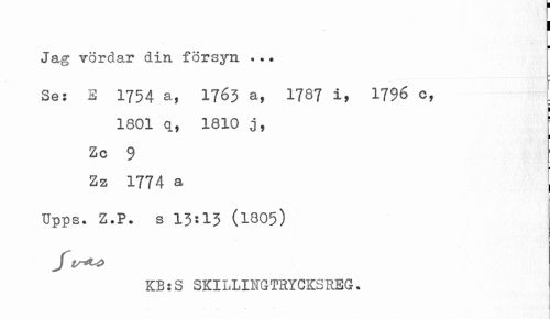 //// Jag vördar din försyn ... //// Ses E I754 a, 1763 a, 1787 i, 1796 c, //// I //// 1801 a, 1810 j, f //// I //// Zc 9 //// I //// Zz 1774 a Upps. Z.P. s 13:13 (1005) //// J tr*>t> //// KB:S SKILLINGTHYCKSREG. ////