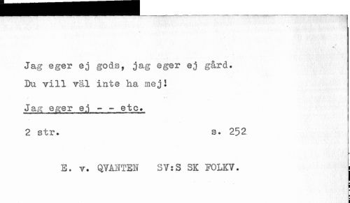 //// Jag eger ej gods, jag eger ej gård. Da vill väl inte ha mej I //// Ja.fr, Qfzer e.j - - etc. //// 2 str. s. 252 //// ¦r //// E. v. QYÅHTEN 3Y:S SK FOLKV. | //// I ////