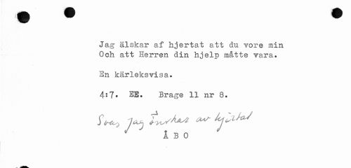 //// Jag älskar af h jer tat att du vore min Och att Herren din hjelp måtte vara. //// \ //// En kärleksvisa. //// 4:7. EE. Brage 11 nr 8. //// " I B O ////