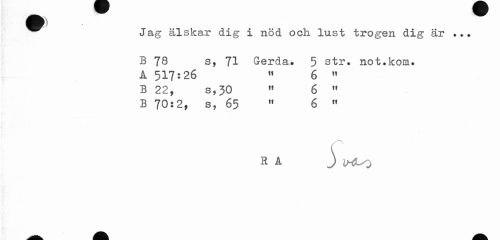 //// ^^ Jag älskar dig i nöd och lust trogen dig är ... //// B 78 s, 71 Ser da. 5 str. not.kom. //// A 517:26 « 6 » //// B 22, s,30 t! 6 " //// B 70:2, s, 65 " 6 " //// H A 3 ////