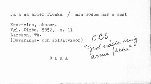//// Ja ä na armer flecka / min mödom har a mest //// Knektvisa, obscen. Vgl. Dimbo, 5852, s. 11 Larsson, Th. //// (Bevärings- och soldatvisor) U ' 0 /VC^^J //// U L M A ////