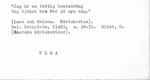 //// "Jag är en fattig bondedräng tog tjänst hos Per på nya äng.11 //// (Lars och Helena. Kärleksvisa). //// Dal. Grangärde, 11482, s. 28-31. Blixt, 0. //// (Enstaka kärleksvisor). //// TT L M A ////