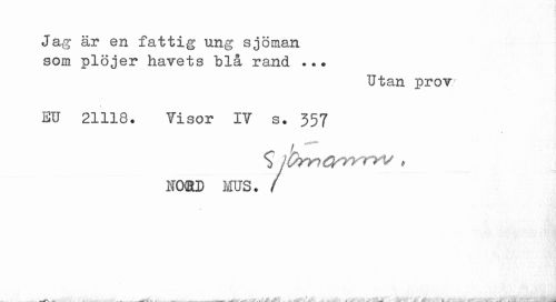 //// Jag är en fattig ung sjöman som plöjer havets "blå rand ... //// Utan prov //// EU 21118. Visor IV s. 357 //// $ J&ryn&yyrvv , NOfiD MUS. / //// .^r-. a ; , t it . l . ... . . j.+ ////