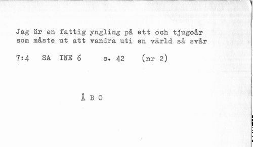 //// Jag är en fattig yngling på ett och tjugoår //// som måste ut att vandra uti en värld så svår //// * //// 7:4 SÅ INE 6 s. 42 (nr 2) //// ÅBO //// ¦ //// ¦ //// i ////