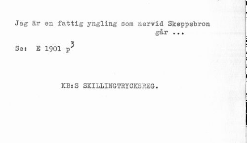 //// I //// Jag är en fattig yngling som nervid Skeppsbron //// går .. • //// % i //// Se: E 1901 p^ //// ¦ ¦ ¦ ¦ //// 1 //// KBsS SKILLINGTRYCKSREG. //// i //// I //// ¦ ////
