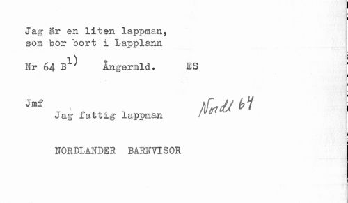 //// Jag är en liten lappman, som bor bort i Lapplann //// Nr 64 B1^ ingermld. ES //// i //// jmf t , /fétH^I //// Jag fattig lappman / //// NORDLANDER BARNVISOR ////
