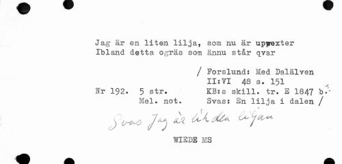 //// Jag är en liten lilja, som nu är upfrexter Ibland detta ogräs som ännu står qvar //// / Forslund: Med Dalälven II: VI 48 s. 151 Ir 192. 5 str. KB:s skill. tr. E 1847 bl' //// Mel. not. Svas: En lilja i dalen / //// v //// WISDE MS ////