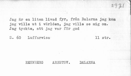 //// Jag är en liten livad fyr, från Dalarna jag kom, jag ville ut i världen, jag ville se mig om. Jag tyckte, att jag var för god //// S. 60 Luffarvisa: 11 str. //// <. //// REMBERG ARBETS V. DALARNA ////