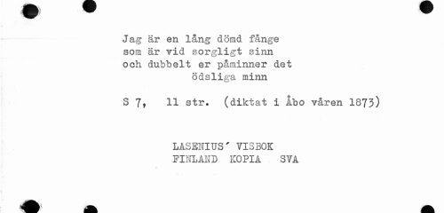 //// w1' //// Jag är en lång dömd fånge som är Tid sorgligt sinn och dubbelt er påminner det //// ödsliga minn //// S 7, 11 str. (diktat i Ibo våren 1873) //// LASEMUS ' VISBOK FINLAND KOPIA SVA //// r ////