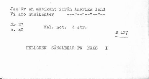 //// Jag är en musikant ifrån Amerika, land Vi äro musikanter ---w-w-11-M- //// Nr 27 //// n Mel. not. 4 str. //// s. 40 D 12? //// KELLGREN SÅNGLEKAR PS MAS I ////