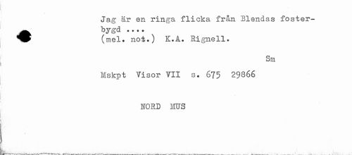 //// I //// Jag är en ringa flicka från Blendas foster-^^ bygd ... //// (mel. not.) K.A. Rignell. //// Sm //// Mskpt Visor VII s. 675 29866 //// 10RD MUS //// J^---___ ___. __ ^ ___ ////