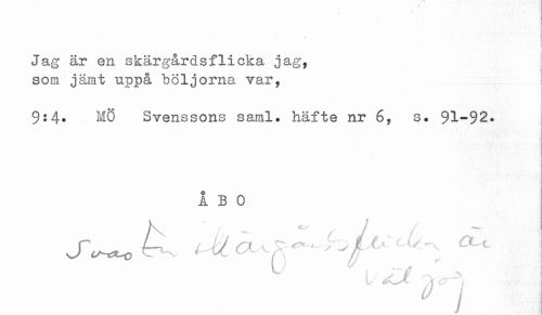 //// ... //// ¦ //// Jag är en skärgårdsflicka jag, //// ¦ t //// som jämt uppå böljorna var, //// 9:4* MÖ Svenssons saml. häfte nr 6, s. 91-92. //// . //// ÅBO //// Su^o ^ 'Jka^X*...hjus^ ä-C //// 0 uZ- > //// ' I ////