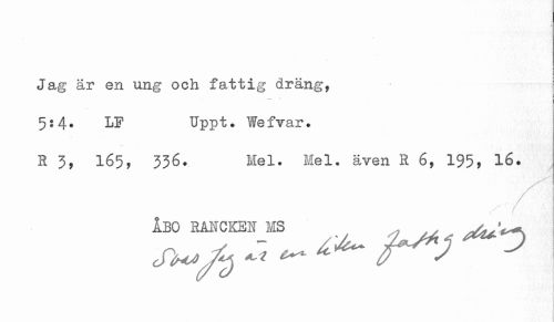 //// Jag är en ung och fattig dräng, 5*4» Ll? Upp t. Wefvar. //// R 3, 165, 336. Mel. Mel. även R 6, 195, 16. //// • Ttf //// A ////