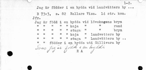 //// Jag är födder i en hydda vid Landvätters by ... //// B 735 3> s. 82 Hallare Tisa. 14 str. kom. Jfr. //// Jag är född i en hjrdda vid lövskogens bryn n » ft »i tt koja tt tt rand //// tt tt tt tt tt stuga 11 w bryn //// " " " n M koja 11 1 andvetters by tf rl rt 11 M stuga " Landvätters by .. " H födder i en ..hydda uti Gillivara by //// ^ /t+jMc ////