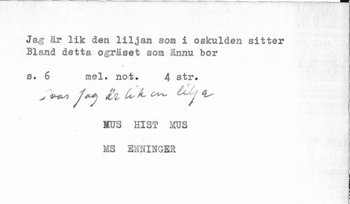 //// Jag är lik den liljan som i oskulden sitter Bland detta ogräset som ännu bor //// s. 6 mel. not. 4 str. //// MUS Hl ST MS //// ¦i » i MS ENNINGER //// ¦ ////