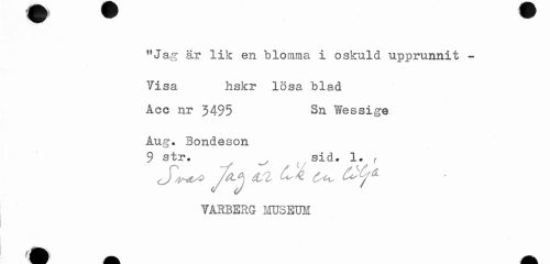 //// "Jag är lik en blonima i oskuld upprunnit -Visa hskr lösa blad //// Åcc nr 3495 Sn Wessige //// Åug. Bondeson //// 9 str. sid. 1. r //// S^yO éUl //// TAKBERG MUSEUM ////