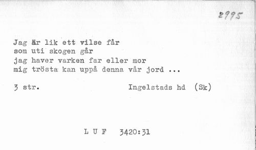 //// *??.sr //// \ //// Jag är lik ett vilse får som uti skogen går //// jag haver varken far eller mor //// mig trösta kan uppå, denna vår jord ... //// 3 str. Ingelstads hd (Sk) //// l u p 3420:31 ////