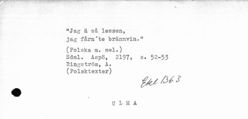 //// ... - ___. '. . • - i « //// T • V //// 11 Jäg ä -så lessen, ' jag fårn'te "brännvin-11 //// (Polska m. mel.) //// Sdml. Aspö, 2197, s. 52-53 //// Ringström, A. (Polsktexter) //// 1 //// u L M A ////