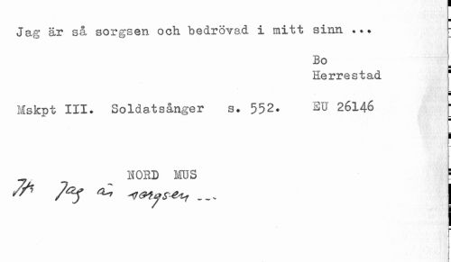 //// ¦ //// Jag är så sorgsen och bedrövad i mitt sinn ¦ //// Bo //// Herrestad 1 //// i //// Mskpt III. Soldatsånger s. 552. 2U 26146 ; //// ¦ //// i //// HORD MUS ! //// l&tys*^ ... j //// r //// 1 //// 1 ////