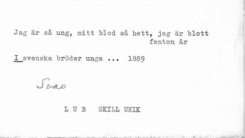 //// Jag är så ung, mitt blod så hett, jag är blott //// femton år //// I svenska bröder unga .*• 1889 //// L U B SEILL UHIK //// " P ' • r • ////