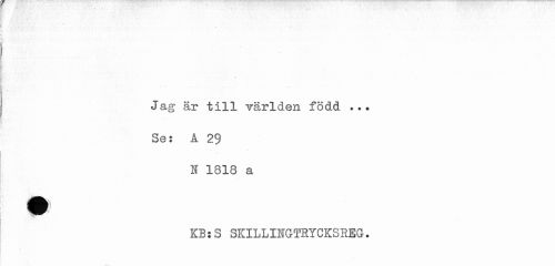 //// Jag är till världen född .•. //// Se: A 29 //// I 1818 a //// m //// KB s S SKILLIIfGTRYCKSREG. ////