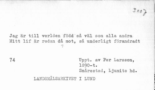 //// Jag är till verlden född'så väl som alla andra //// Mitt lif är redan då mot, så underligt förandradt //// * //// 74 Uppt. av Per Larsson, //// 1890-t. //// Snårestad, Ljunits hd. //// i //// landsmåls arkivs t i lund //// i ////