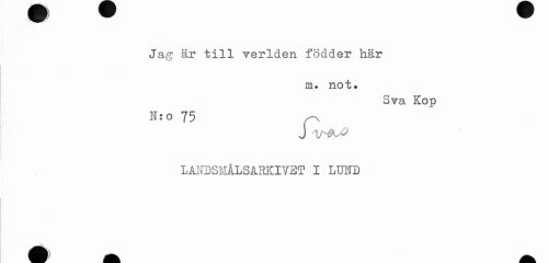 //// Ww //// Jas<r är till verlden födder här //// 3 //// m. not» //// Sva Kop //// I: o 75 //// J //// LANDSMÅLSARKIVBT I LUID ////