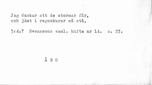 //// » //// Jag önskar att de stormar får, och jämt i regnskurar må stå, //// 5:4*? Svenssons saml. häfte nr 14* s» 27* //// I //// ÅBO //// \ ////