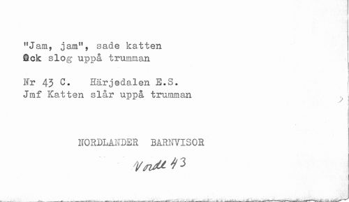 //// "Jam, jam", sade katten //// Bok slog uppå trumman //// Nr 43 C. Härjedalen E.S. //// Jmf Katten slår uppå trumman //// NORDLANDER BARNVISOR //// _______ ^ , ^- ////