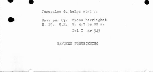 //// Jerusalem du helga, stad .. //// ^^ Dav. ps+ 87* Zions herrlighet //// H. Bj. G.K. W. 4+7 PS 88 s. //// Del I nr 343 //// I //// RANCKEN FÖRTECKNING //// ^......- ////