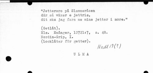 //// "Jetteroro p& Slammer&sen //// där så växer e jettris, //// dit ska jag fara me mine jetter i more." //// (Getl&t). //// Hls. Enåmger, 12721:7, s. 48. //// Nordin-Grip, 1. //// (Locklatar för getter). //// ^ U L M Å ////