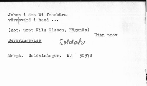 //// Johan i åra Wi frambära //// vårajsvärd i hand ... //// (not. uppt Nils Olsson, Höganäs) //// Utan prov //// Beväringsvisa r . //// Mskpt. SoIdatsånger. EU 3097S //// ' a //// . ^ ////