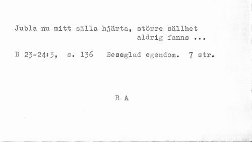 //// Jubla nu mitt sälla hjärta, större sällhet ! //// aldrig fanns ... //// B 23-24:3? s. I36 Beseglad egendom. 7 str. //// R Å ////