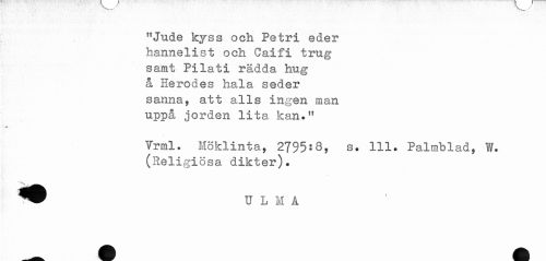 //// "Jude kyss och Petri eder //// hannelist och Caifi trug //// samt Pilati rädda hug //// å Herodes hala seder //// sanna, att alls ingen man //// uppå jorden lita kan." //// *' //// Trml. Höklinta, 2795:8, s. 111. Palmblad, W. //// (Religiösa dikter). ////
