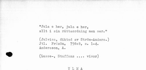//// "Jula e her, jula e her, //// allt i sin råttaordning men ser." //// (Julvisa, diktad av Ström-Anders.) //// Jtl. Fröson, 798:8, s. 1-4. //// Andersson, A. //// ^^ (Lusse-, Staffans .... visor) //// II T, w A ////
