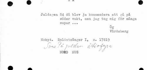 //// Juldagen 84 d& blev ja kommendera att gå på, //// söder vakt, men jag tog mig för många //// supar ... //// w.* //// Og //// Vårdsberg //// Mskpt. Soldatsånger 1, s. 1781$ //// NOaD MUS ////
