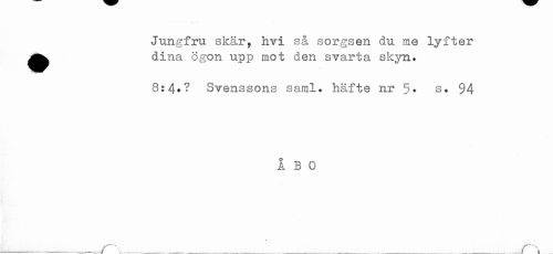 //// Jungfru skär, hvi så sorgsen 3u me lyfter //// ^^ dina ögon upp mot den svarta skyn. //// 8:4*? Svenssons saml. häfte nr 5. s. $4 //// ÅBO //// ____________________________________________________' ____________________________ ________ r -t ////