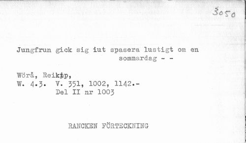 //// Jungfrun gick sig iut spasera lustigt om en //// sommardag - - //// Yiforå, Reikip, //// W. 4.3* V. 351, 1002, 1142.- //// Del II nr 1003 //// RAI^CKEN FÖRTECKNING ////