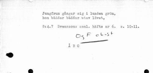 //// Jungfrun gångar sig i lunden grön, //// hon bäddar bäddar utav lövet, //// 8:4*? Svenssons saml. häfte nr 6. s. 10-11. //// ÅBO ////